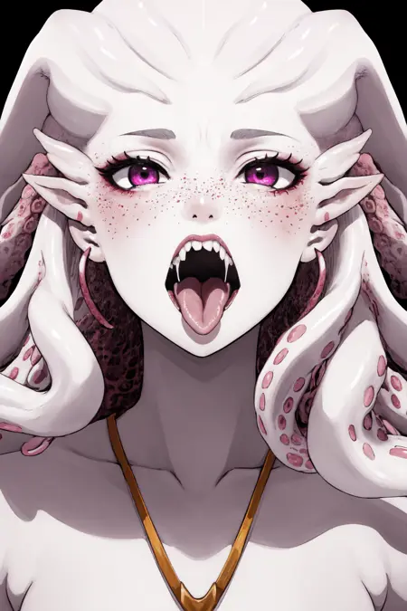 触发词:必须始终使用 "HuntressSub, monster girl, colored skin, pink skin, tentacle hair",为保持一致性,可添加 "雀斑, 粉色眼睛"。