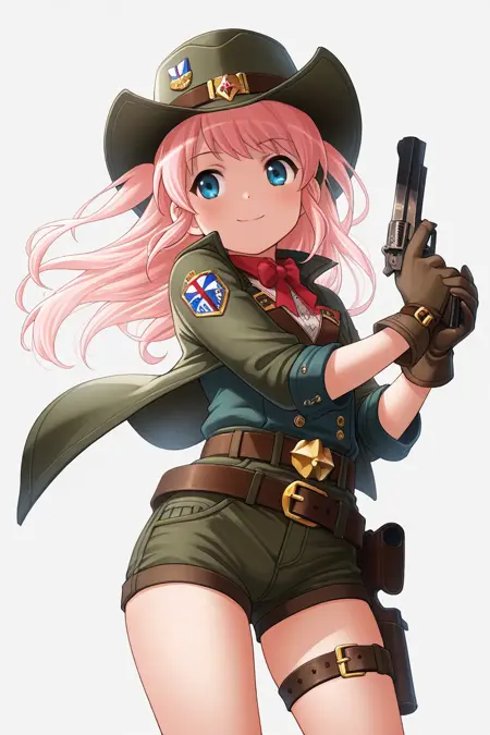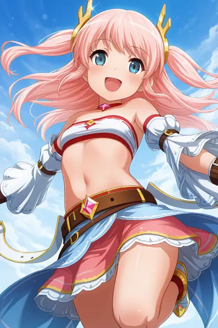 lalafin, 1girl, solo, blue eyes, gloves, brown gloves, long hair, rabbit hair ornament, smile, open mouth, long sleeves, belt, two side up, red scarf, belt, dress, thigh strap, stage outfit, stage play,