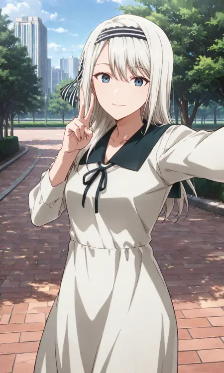 keimv, 1girl, solo, long hair, blue eyes, striped hairband, white hair,