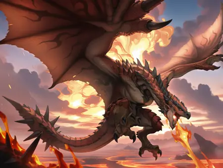 标签(龙):rathalos,无人类,尖牙,红龙,张开翅膀,飞行,