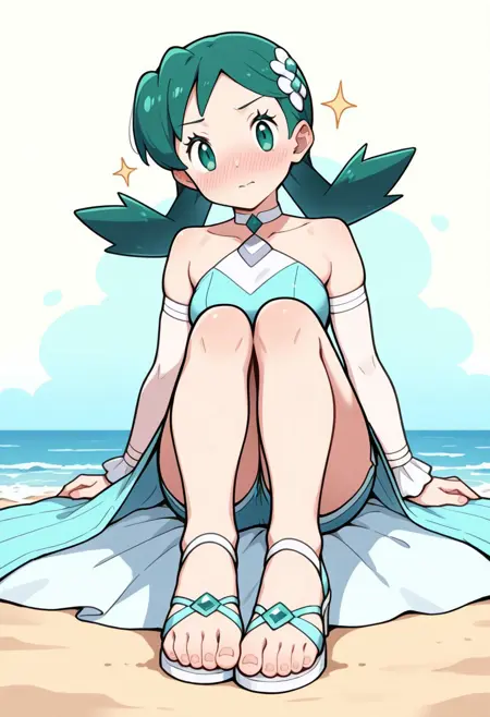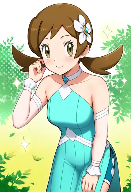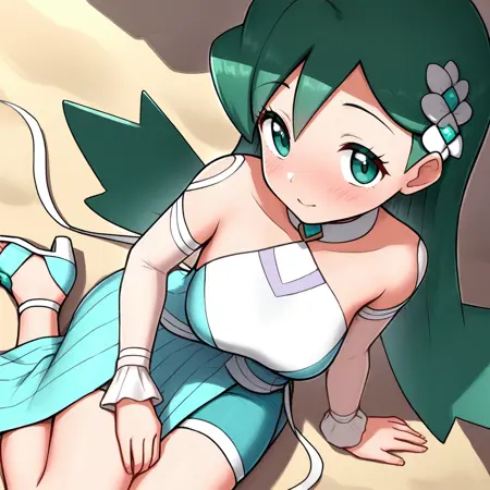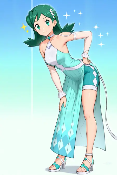 | Trained Words | sygkris, kris \(pokemon\), green eyes, green hair, medium hair, hair ornament, halter dress, bare shoulders, choker, aqua dress, side slit, detached sleeves, wrist cuffs, aqua shorts, shorts under dress, long dress, high heel sandals, white footwear, aqua footwearCopied! |