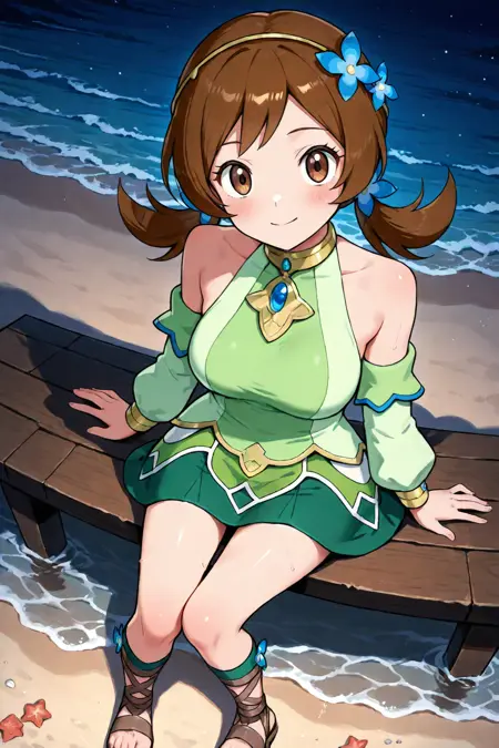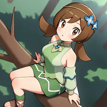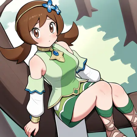 syglyra, brown eyes, brown hair, bangs, low twintails, hairband, hair flower, choker, blue gemstone, detached sleeves, bare shoulders, long sleeves, green shirt, green skirt, gladiator sandals, brown footwear, green footwear