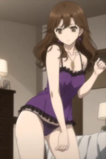 HarukaOuma, 1girl, solo, brown hair, jewelry, earrings, necklace, underwear, brown eyes, lingerie, long hair, camisole, panties, frills