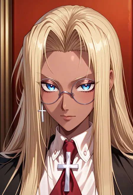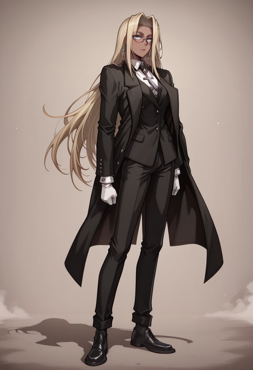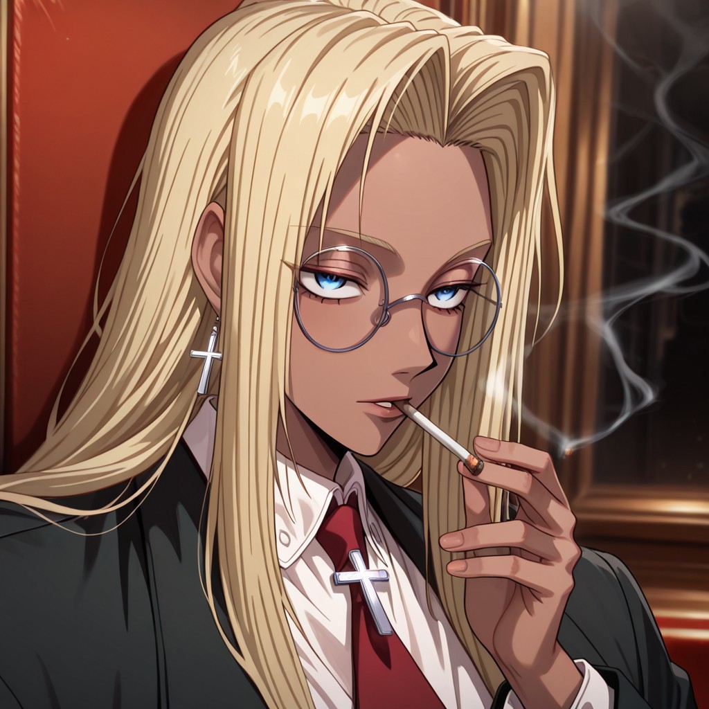 Integra-Hellsing-IL/Pony.V1.1 1girl, blonde hair, very long hair, vlue eyes, dark-skinned female, dark skin, glasses,