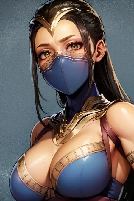 其他提示词:黑发,长发,黄眼睛,口部面罩,露指手套,乳沟,深色皮肤