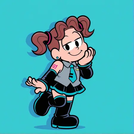 denise, short twintails, purple dress, brown hair
