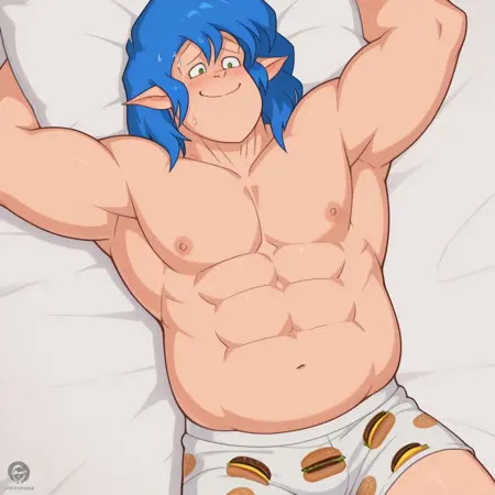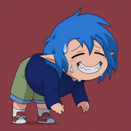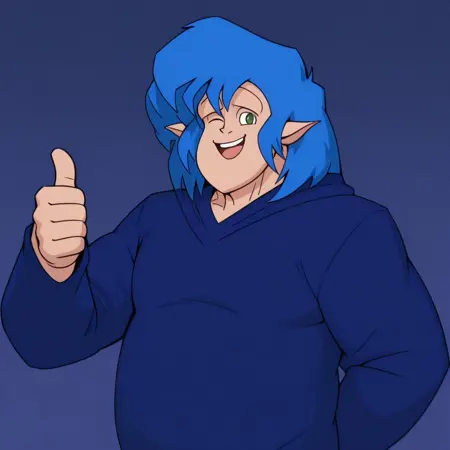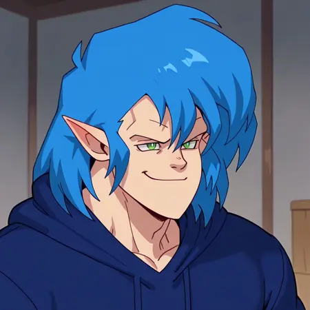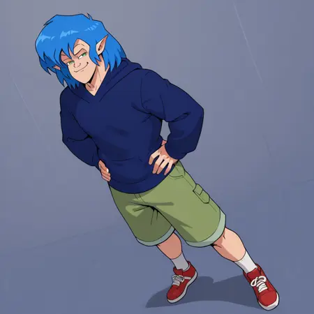 ゴナード、男性、筋肉質、長い青い髪、とがった耳、緑の虹彩、濃い青のフード付きパーカー、薄い緑のショートパンツ、白い靴下、赤いスニーカー、
