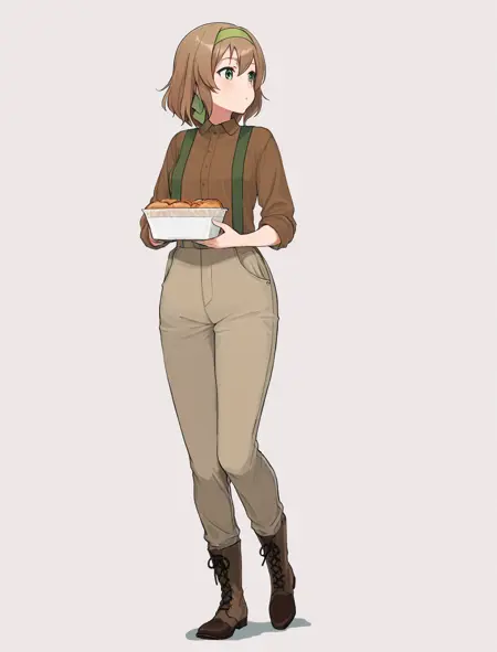 necktie, brown shirt, straps, necktie, green hairband, brown pants
