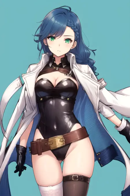 ElenaFFBE, 1girl, solo, long hair, thighhighs, black gloves, white gloves, cleavage, jewelry, medium breasts, green eyes, blue hair, jacket, braid, belt, leotard, thigh strap, sleeves rolled up,