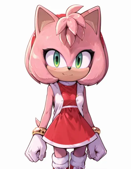 Default Outfit: amy_rose_sonic4, 1girl, slim, skinny, furry, female furry, pink hair, green eyes, headband, snout, red dress, white vest, button, bracelets, white gloves, boots