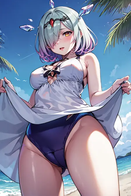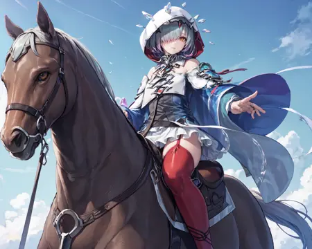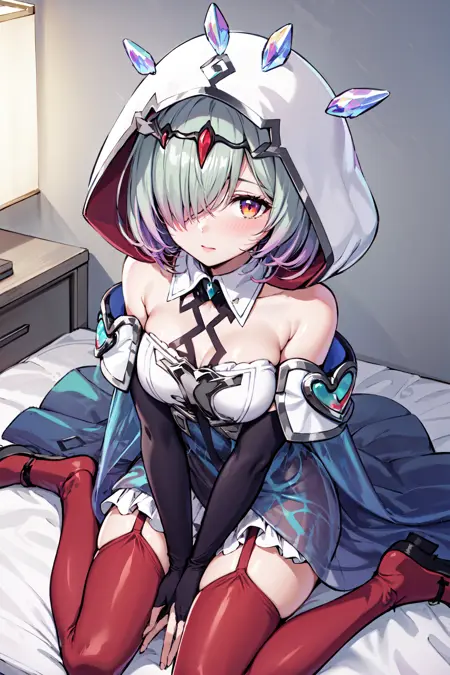 【default outfit Prompt】: def_kvasir, hair over one eye, red thighhighs, white frilled skirt, blue dress, red thigh boots, bare shoulders, dress hood, garter straps, wide sleeves, bridal gauntlets, gradient clothes, long sleeves, detached sleeves, short dress, gloves, detached collar, thighs, multicolored clothes, zettai ryouiki,