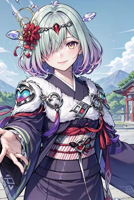【New year outfit Prompt】: new_kvasir, hair over one eye, japanese clothes, purple kimono, obi, flower, gradient clothes, sash, wide sleeves, multicolored clothes, black zouri, fur trim