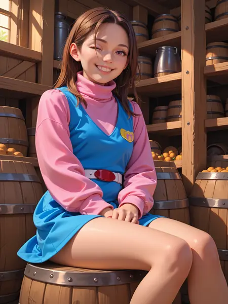 Refiners: blue dress, pink shirt, long sleeves, turtleneck, white and red belt, socks, red mary janes