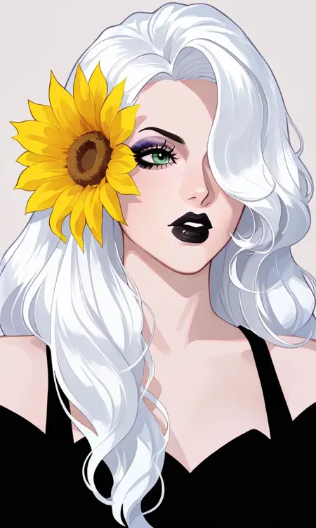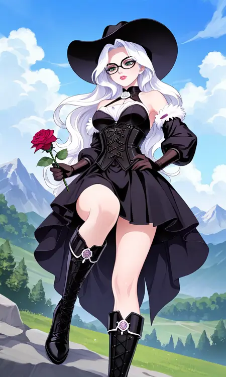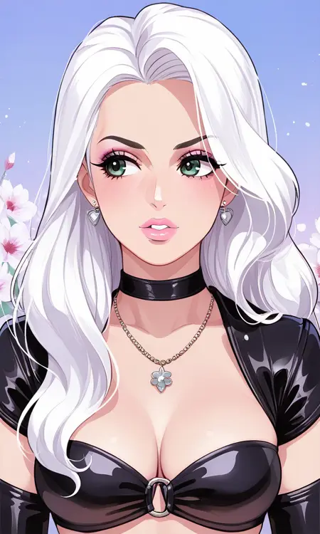 felicia hardy,1girl,long hair,white hair,domino mask,green eyes,makeup,spiked black choker,cleavage,fur-trimmed bodysuit,white fur,fur-trimmed sleeves,long sleeves,black bodysuit,elbow gloves,white gloves