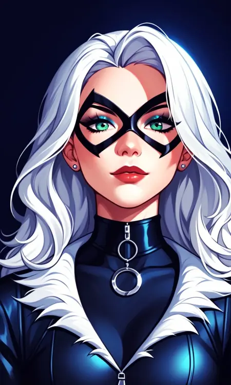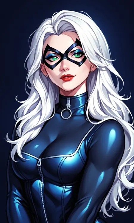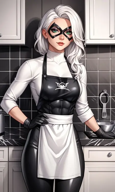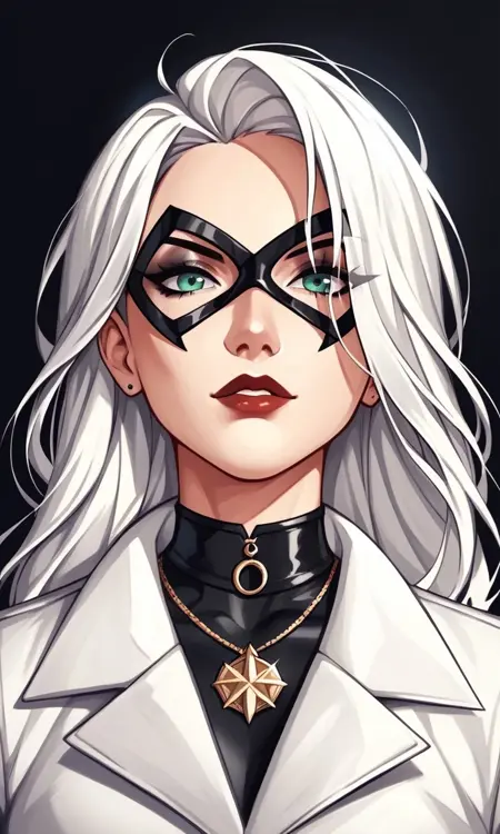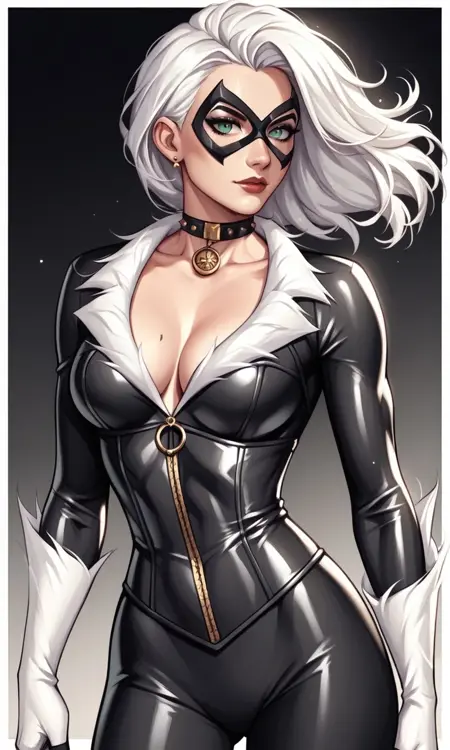 1woman, white hair, green eyes, domino mask,black bodysuit, white fur trim, black gloves, makeup