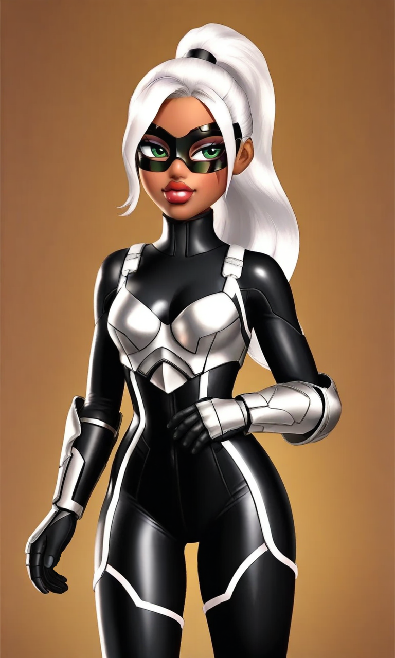 1girl,ponytail,white hair,green eyes,domino mask,black bodysuit,white trim,gauntlets,black gloves