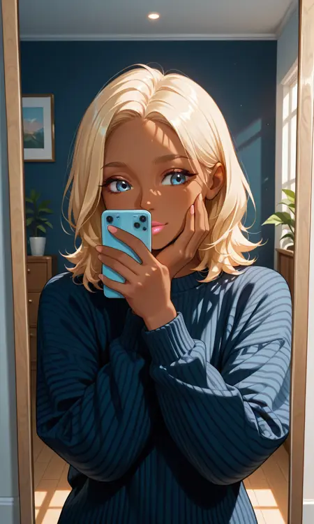 1girl, medium hair, blonde hair, dark-skinned female, blue eyes, pink lips, halterneck, blue tank top, black belt, striped pants, black stripes, white stripes, vertical stripes