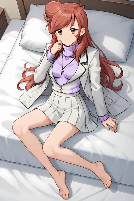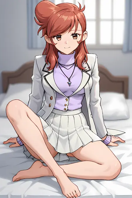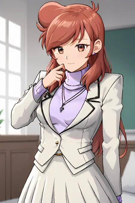 白いジャケット、紫のセーター、タートルネック、白いスカート、ペンダント、フォーマル