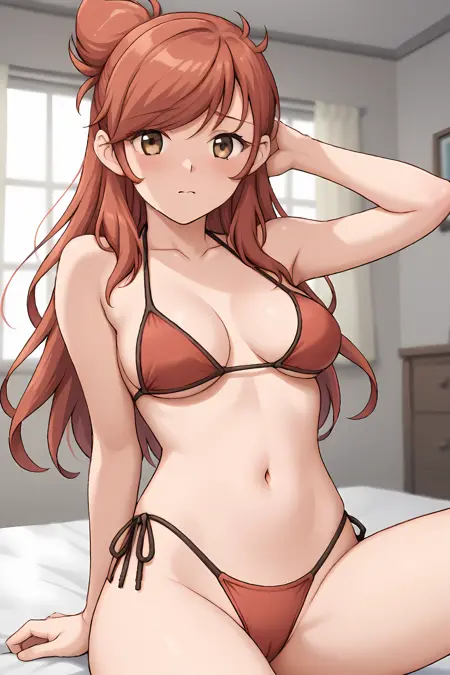 赤髪、茶色の目、長い髪、ボリュームのある髪、流れ眉