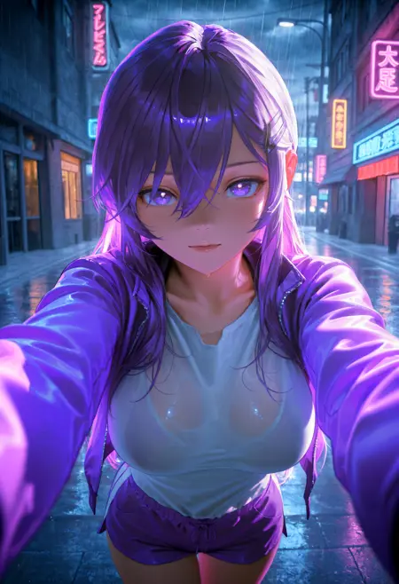 紫色眼睛,明亮的瞳孔,紫色头发,大乳房,