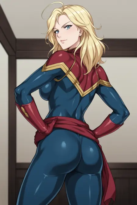 基本プロンプト:carol danvers、長い髪、金髪、あほ毛、青い目