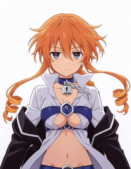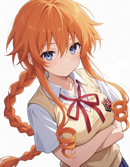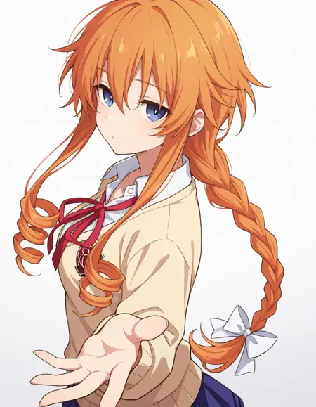 Yuzuru, long hair, orange hair, braid, long braid, single braid, drill sidelocks, blue eyes