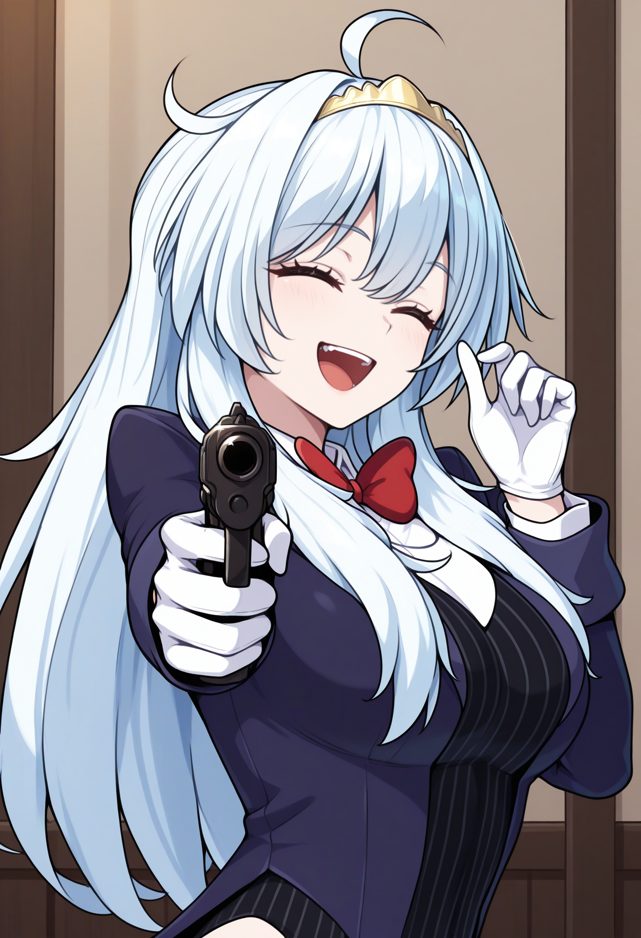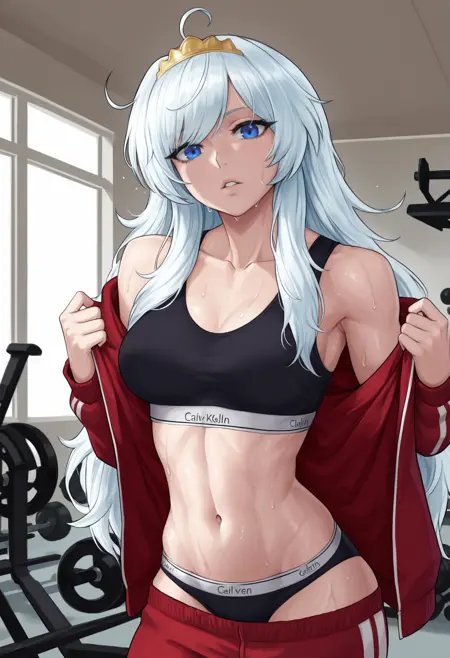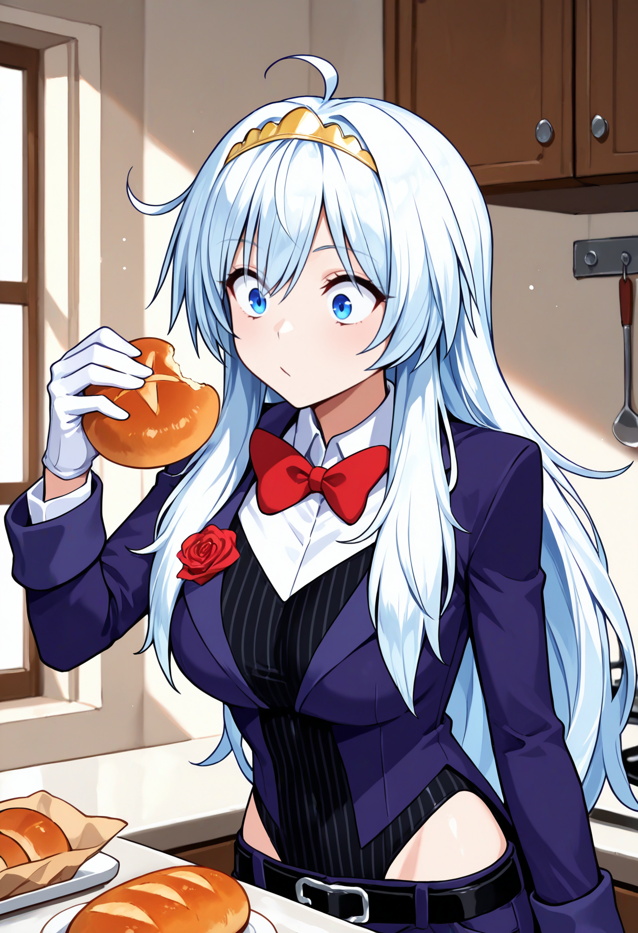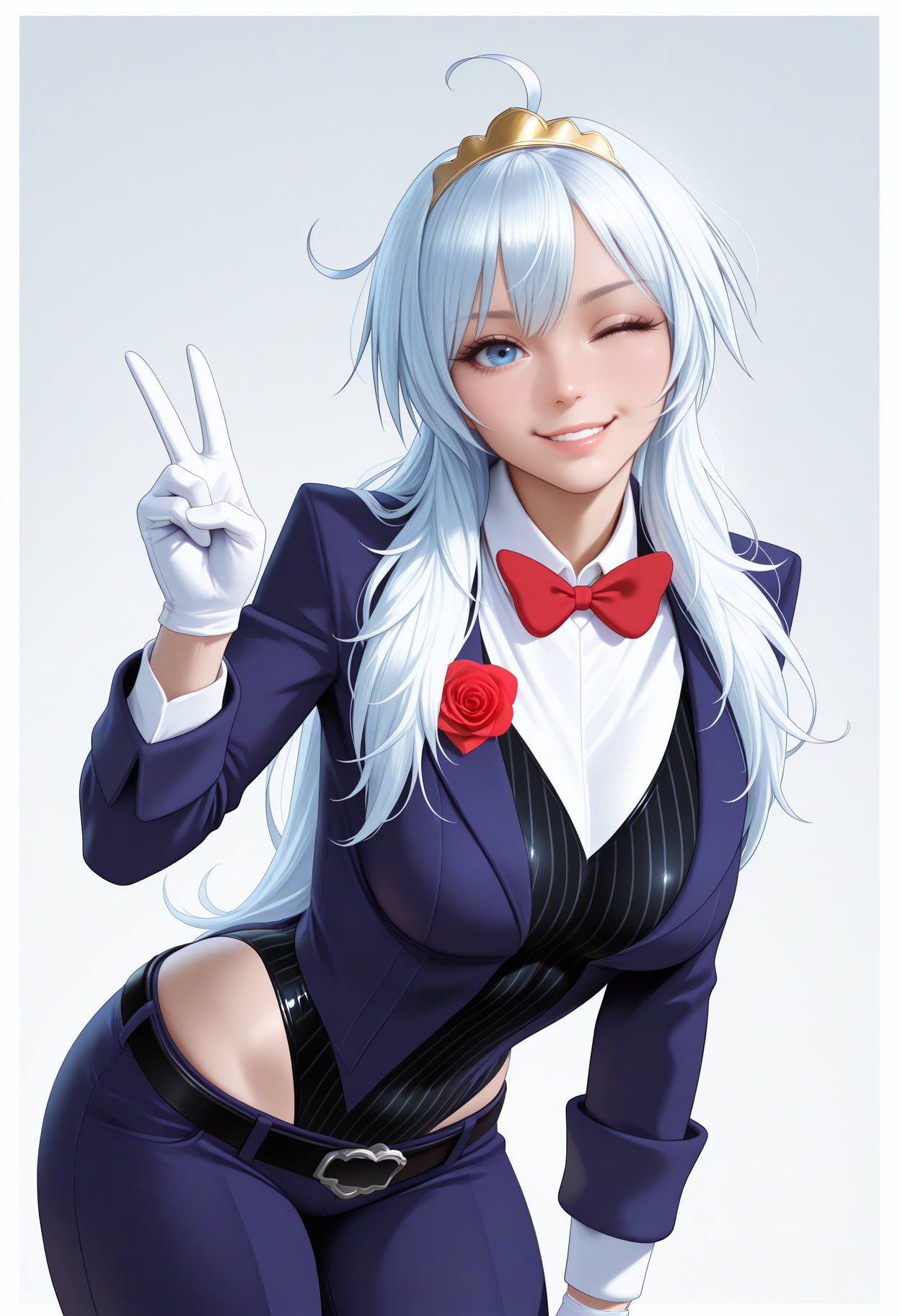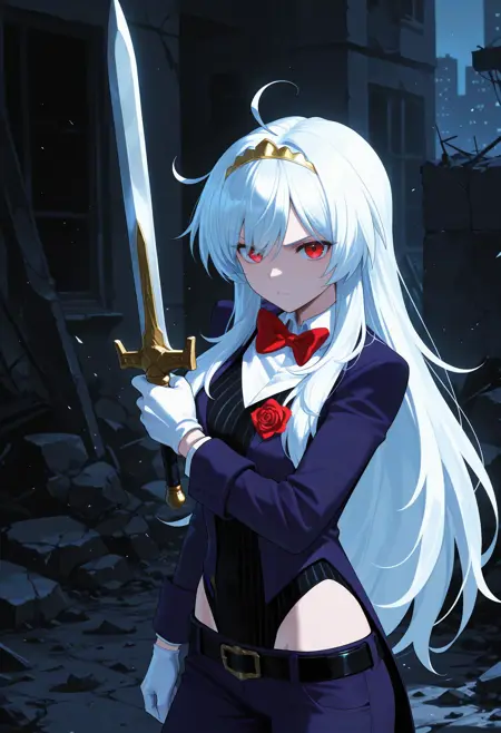 デフォルトの衣装: ティアラ、青いジャケット、開いたジャケット、赤い薔薇、長袖、黒いレオタード、縦縞のレオタード、白いシャツ、衿付きシャツ、赤いリボン、白い手袋、青いズボン、黒いベルト