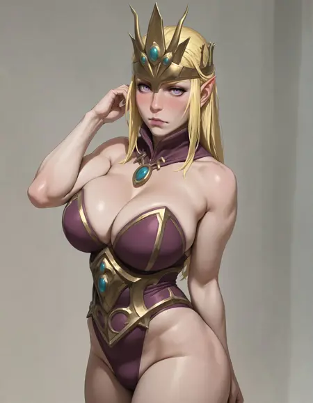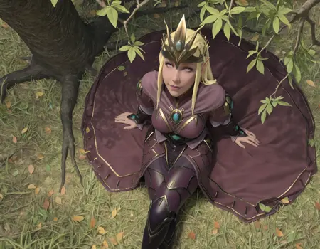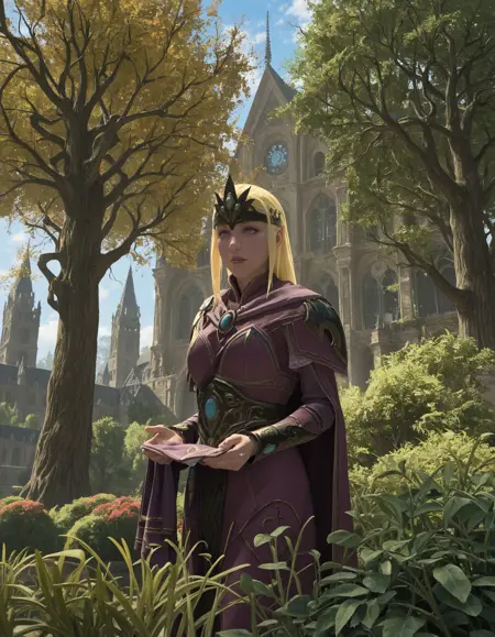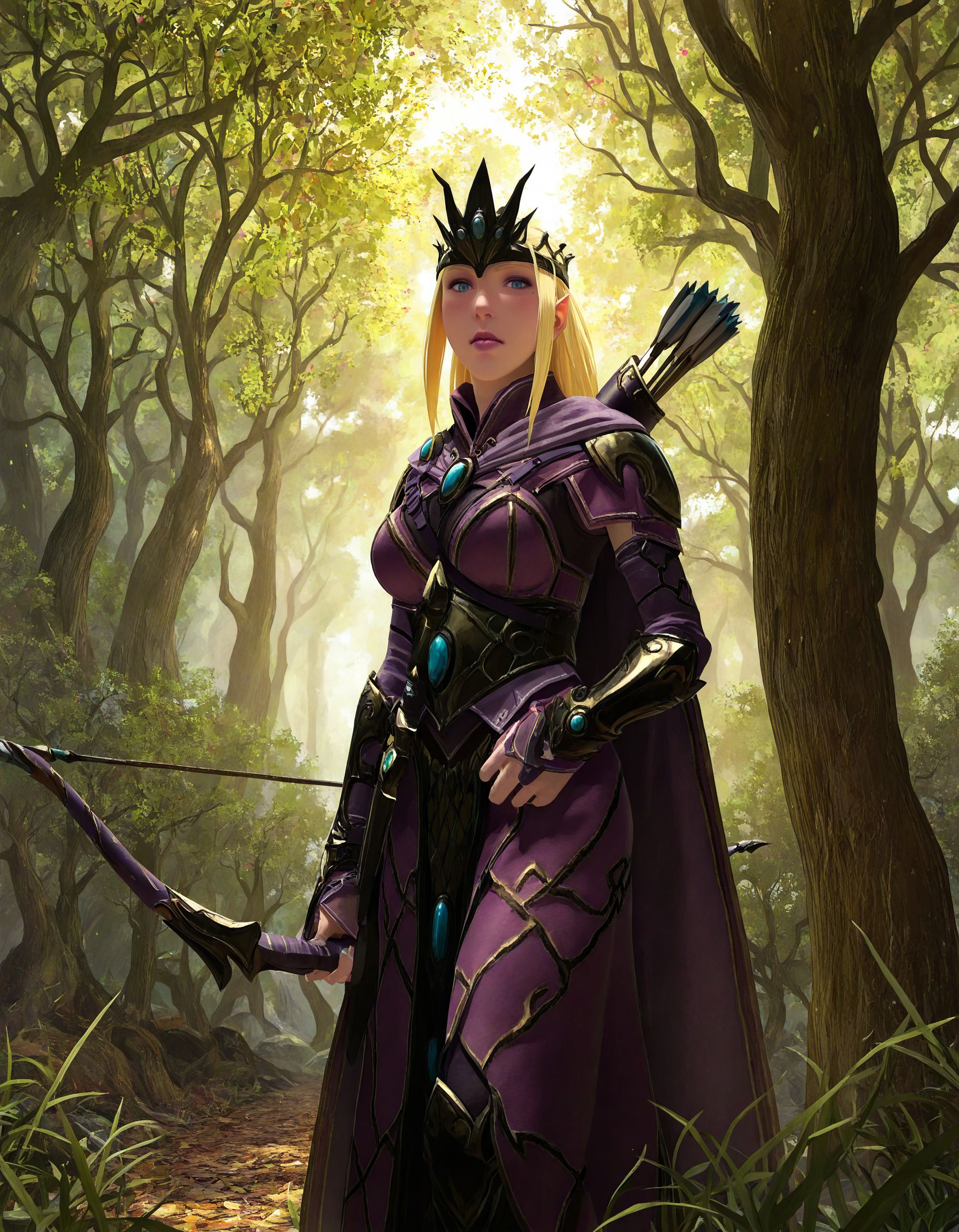 Marrisith, crown, blonde hair, pointy ears, armor, cape,