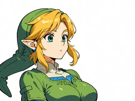 Link, elf, 1girl, large_breasts, blue_eyes, pointy_ears, blonde_hair,
