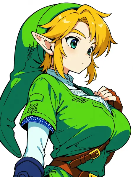 Link, 엘프, 1소녀, 큰가슴, 파란눈, 날카로운 귀, 금발 머리,