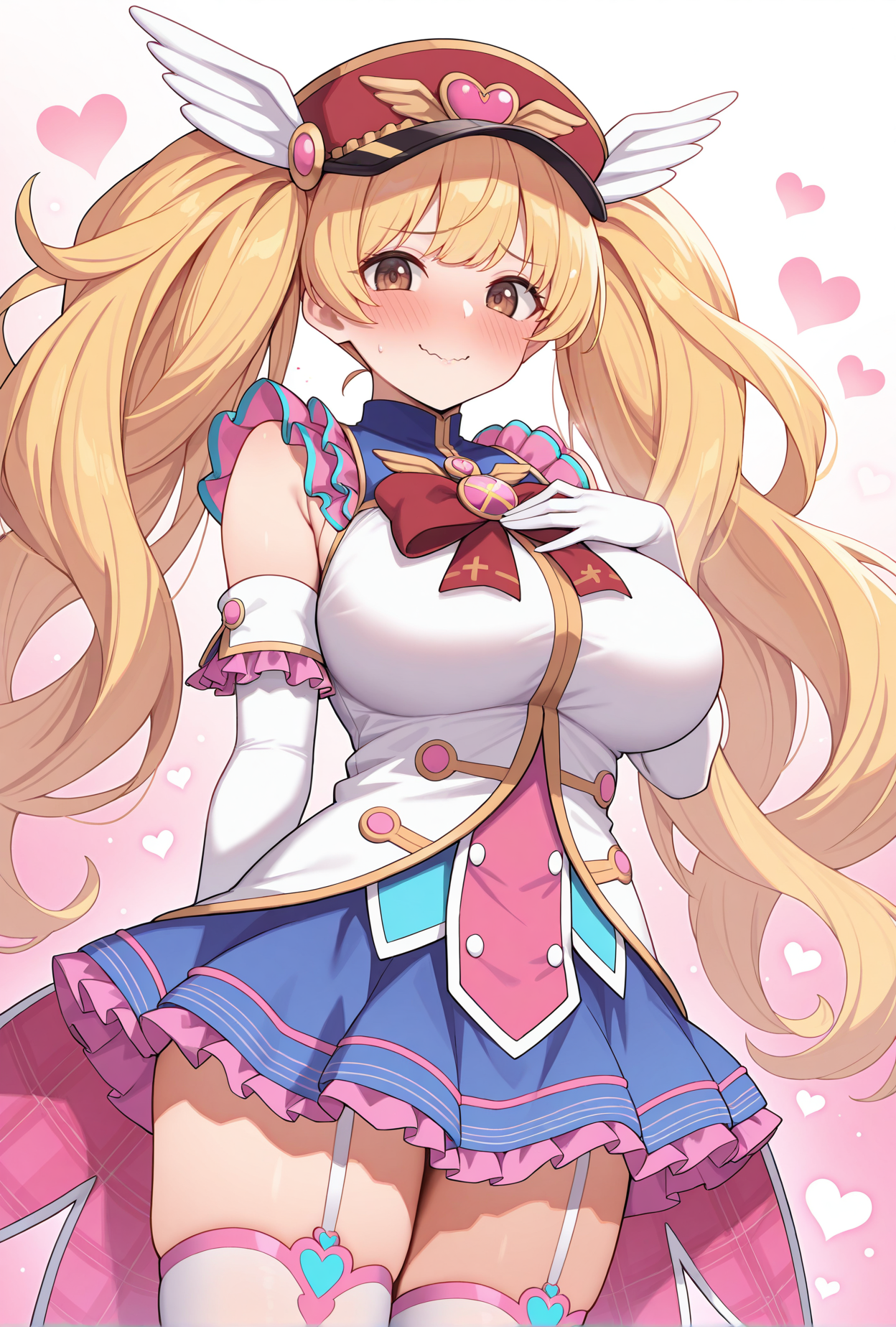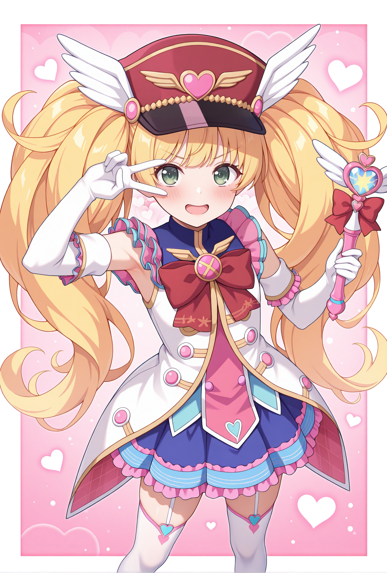 - monigmag,魔法少女,非常长的头发,红色头饰,尖顶帽,带翼帽,心形图案,白色衬衫,多彩衬衫,无袖,蓝色领子,荷叶边,红色蝴蝶结,胸针,白色手套,肘部手套,蓝色裙子,格子图案,荷叶边,白色过膝袜,吊带袜,粉红色鞋子,