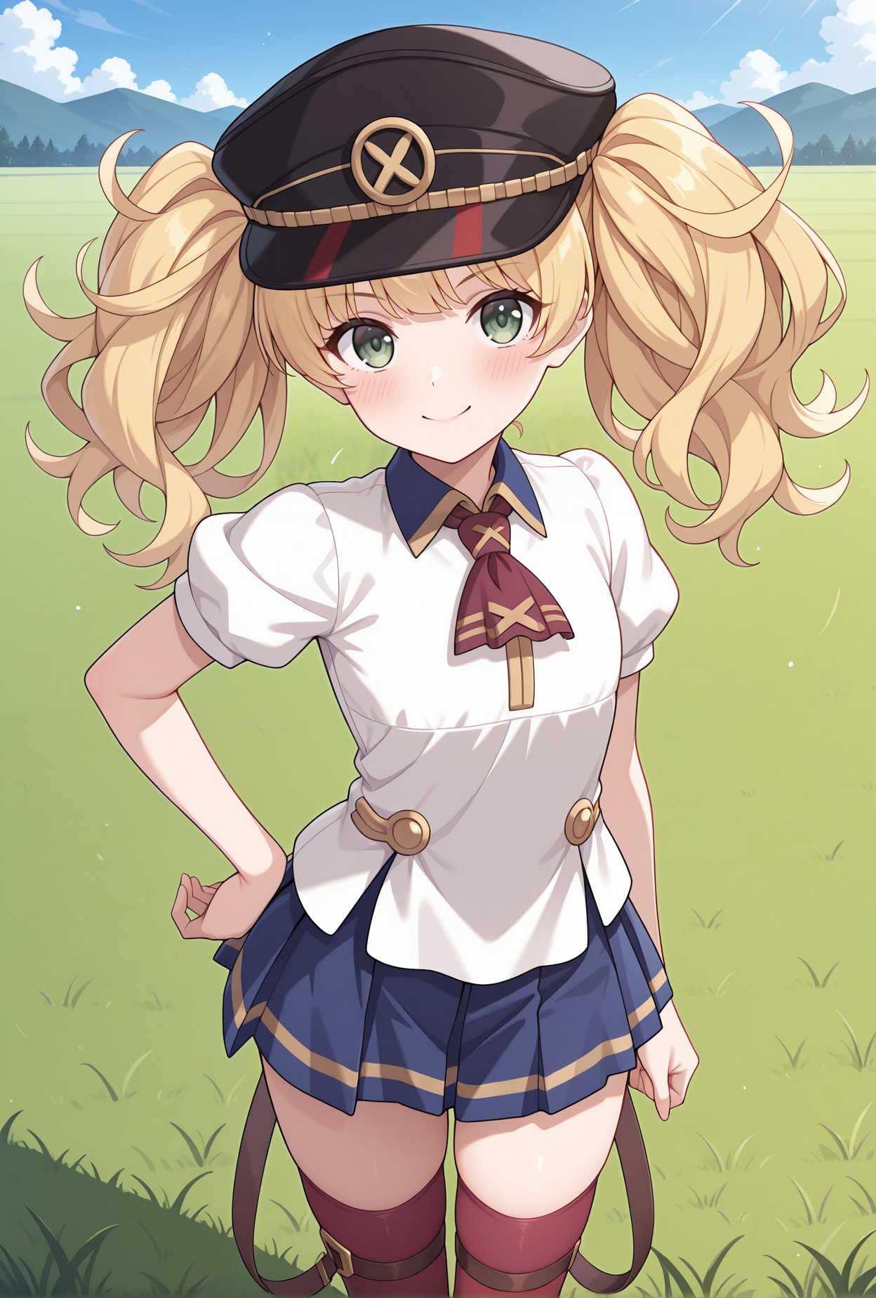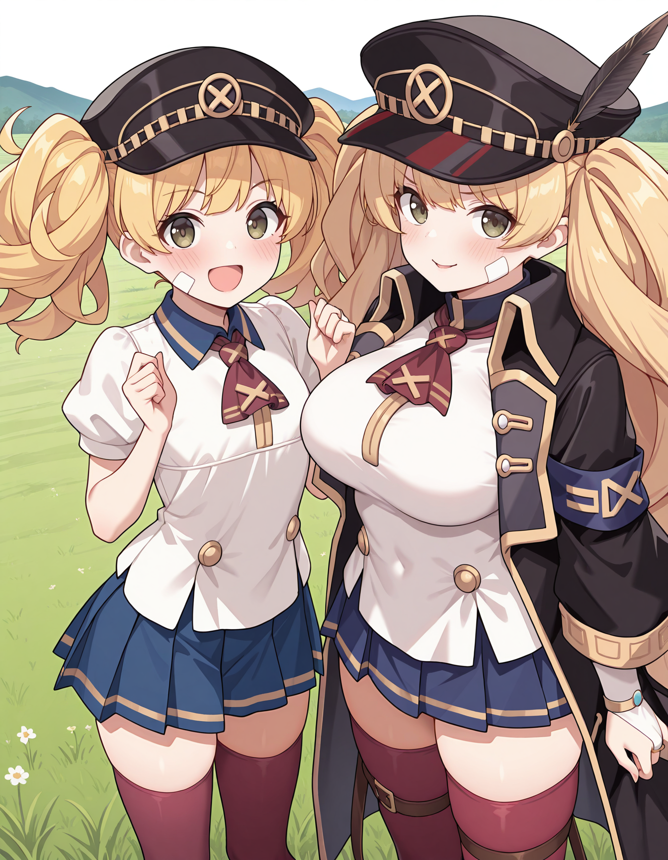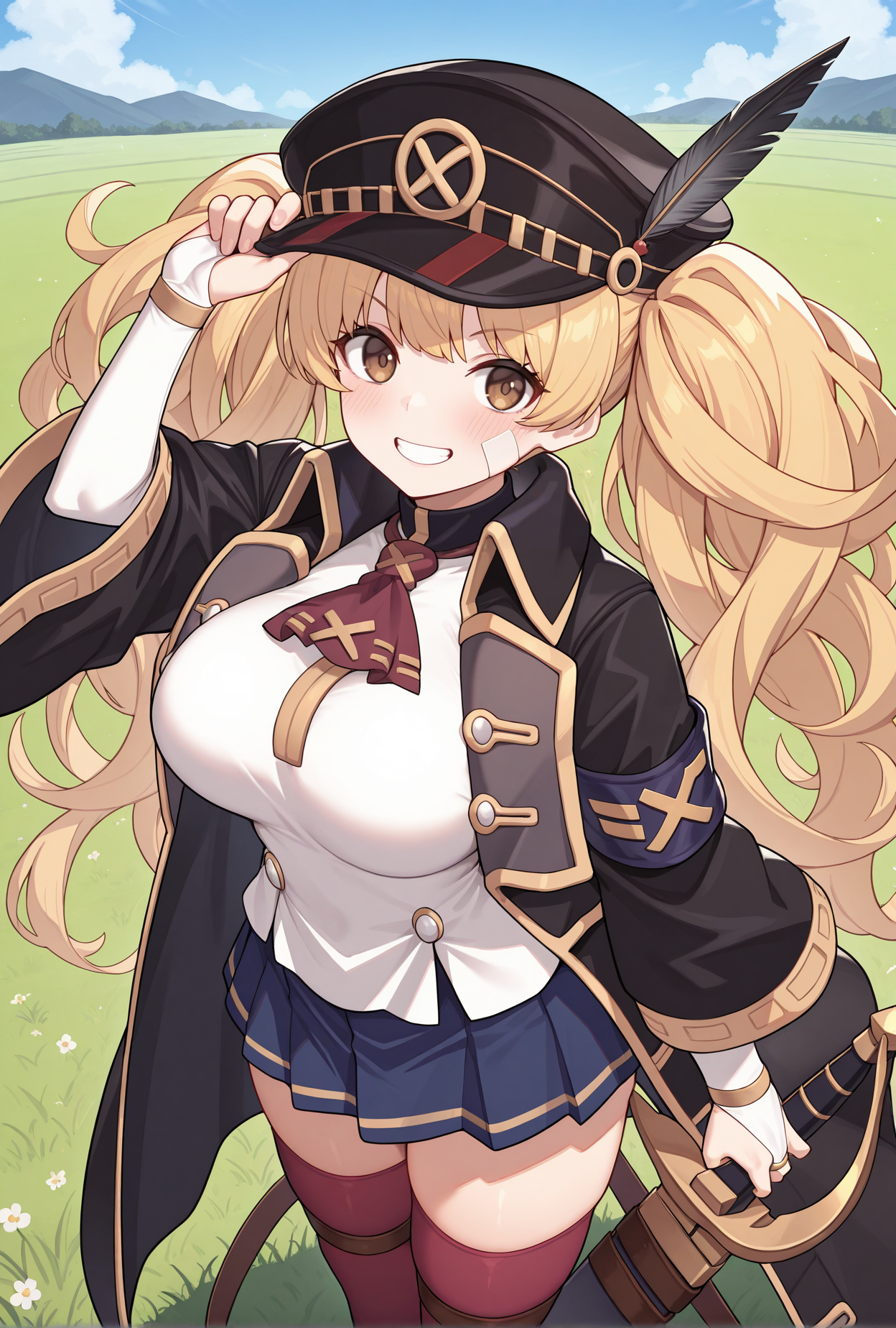monigdef,脸上有创可贴,黑色头饰,尖顶帽,帽羽,黑色外套,敞开式外套,蓝色臂章,黑色领子,立领,红色领结,白色衬衫,白色新娘手套,蓝色裙子,百褶裙,红色过膝袜,大腿绑带,黑色靴子,