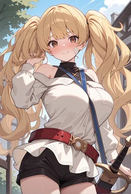 - monigcas,脸上有创可贴,露肩衬衫,白色衬衫,内搭衬衫,黑色衬衫,高领,裸露肩膀,长袖,蓝色肩带,红色腰带,黑色短裤,黑色靴子,