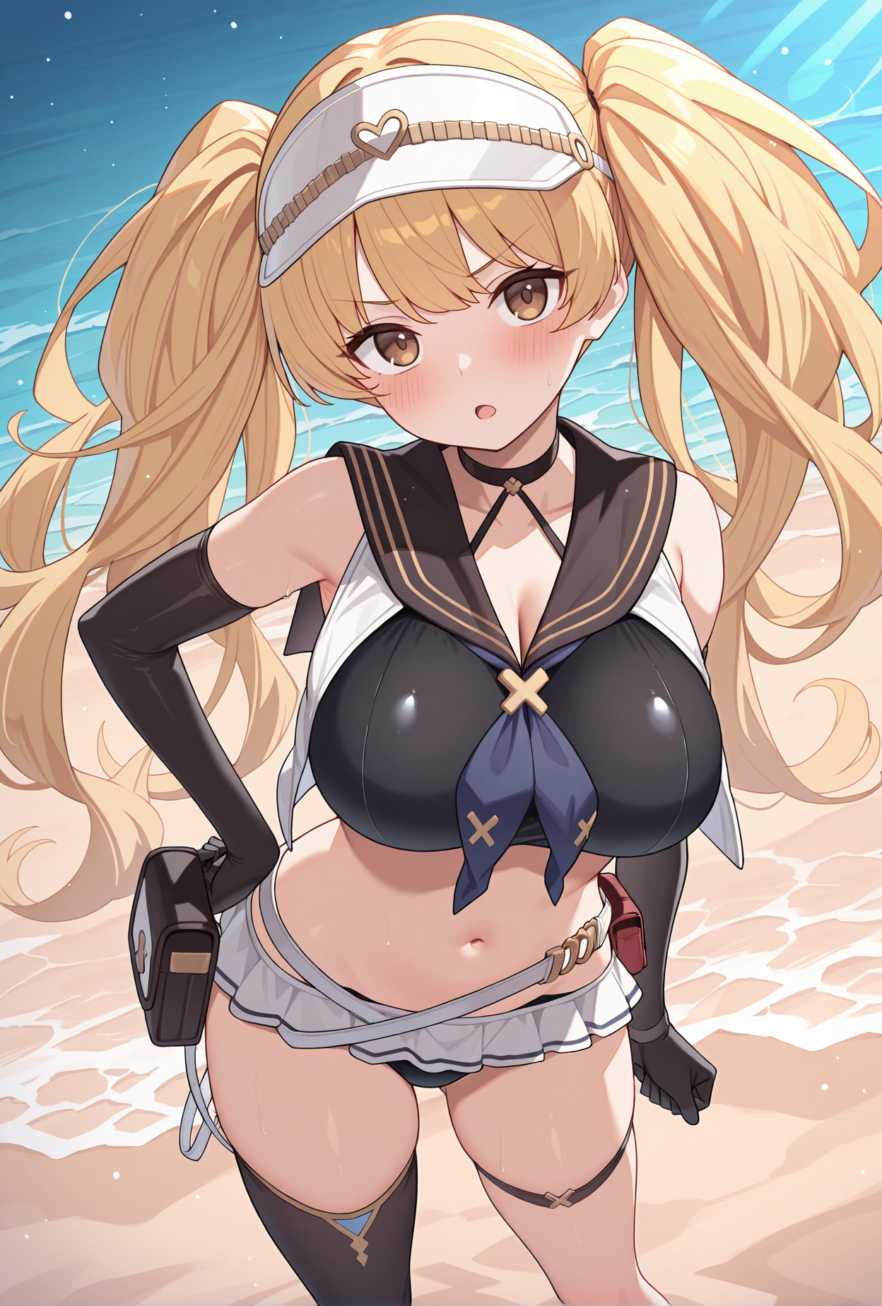 - monigbsm,泳装,白色遮阳帽,黑色水手领,蓝色围巾,黑色项圈,黑色短上衣,敞开式背心,露脐,黑色手套,肘部手套,白色短裙,超短裙,单侧过膝袜,白色腰带,小包,