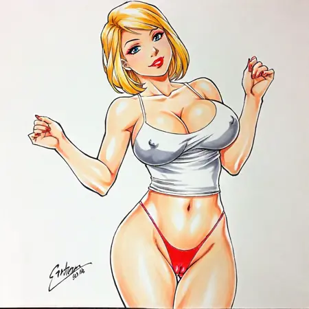 带内衣的触发词:powergirl, 1girl, 大胸部, 内衣, 红色内裤, 金发, 无袖上衣, 深V, 马克笔(中等), 传统媒介, 蓝眼睛, 唇膏, 妆容, 肚脐, 覆盖的乳头, 锁骨, 高腰内裤, 粉色内裤, 短发, 红唇, millipen(中等), 骆驼趾, 无胸罩