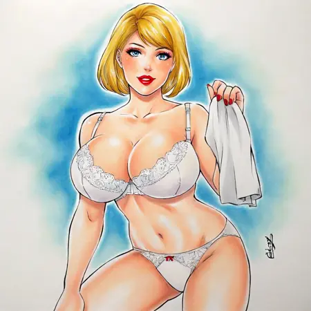 带白色内衣的触发词:powergirl, 1girl, 内衣, 大胸部, 金发, 白色内裤, 蓝眼睛, 白色胸罩, 短发, 深V, 唇膏, 肚脐, lingerie, 妆容, 指甲油, 红色指甲, 传统媒介, 嘴唇