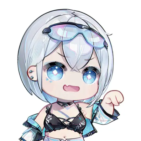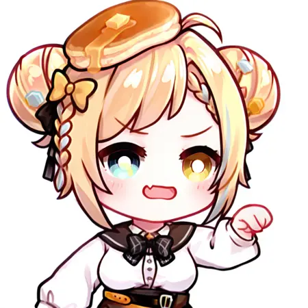 masterpiece, best quality, amazing quality, very aesthetic, absurdres, newest, crawlaway, 1girl, solo, upper body, pointing, open mouth, fang, skin fang, chibi, looking at viewer, simple background,