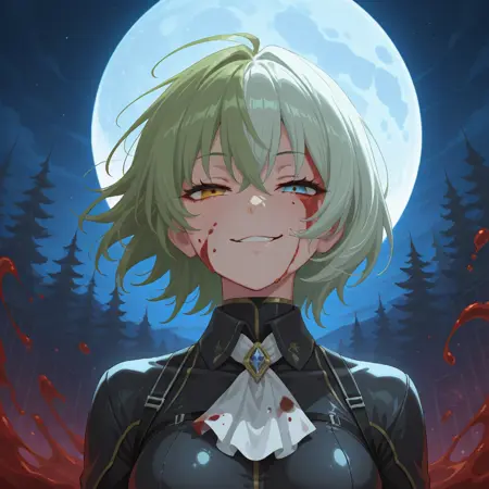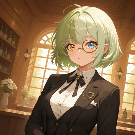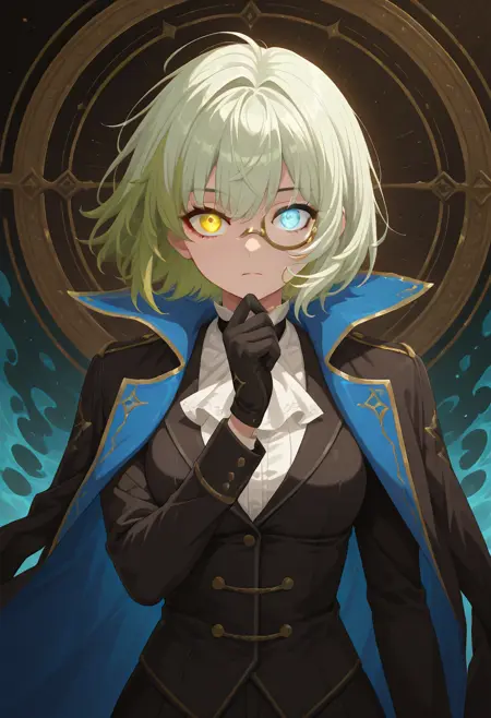 sn-tsisyphus, 1girl, 短发, 分色头发, 绿白色头发, 异色瞳, 蓝棕色眼睛, 单人,