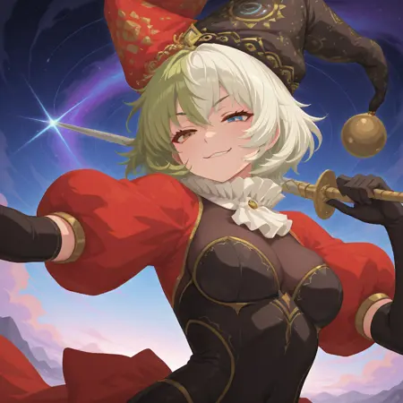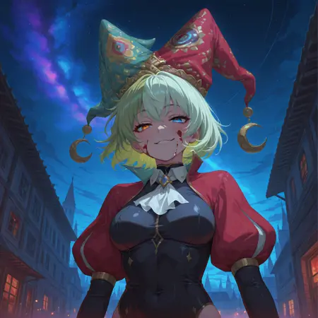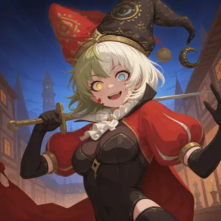 小丑, 小丑帽, 替换服装, 红色斗篷, 白色领结, 有领短连体衣, 绝对领域, 红色蓬松袖子, 缝合腿部, 不对称袜子, 红色袜子, 黑色竖条纹袜子,