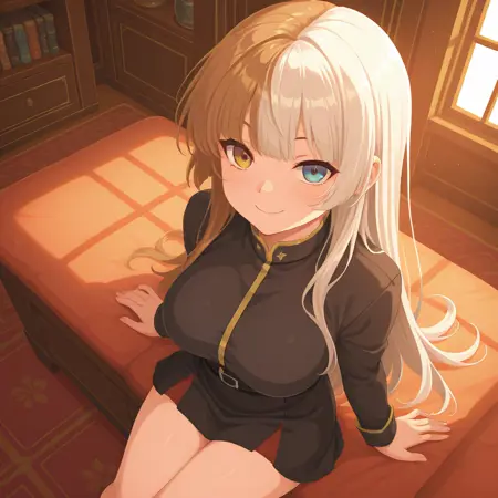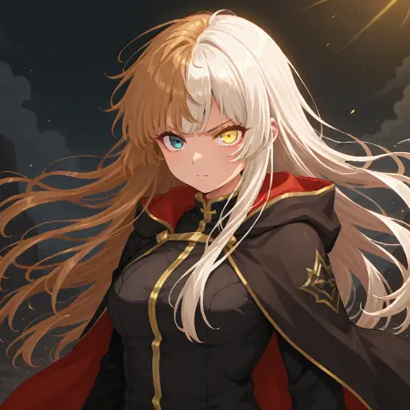 1. sn-trickster, 1girl, long_sidelocks, split-color hair, brown-white hair, heterochromia, brown-blue eyes, no headwear,