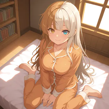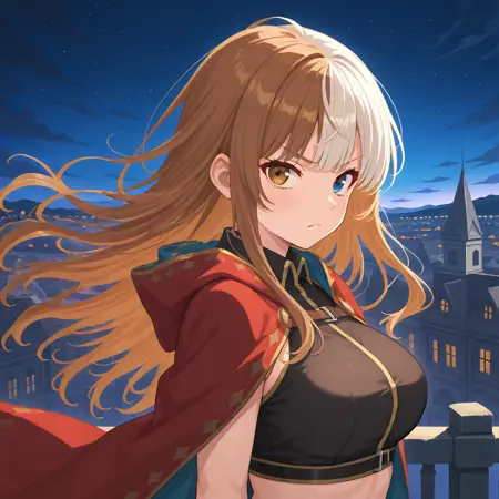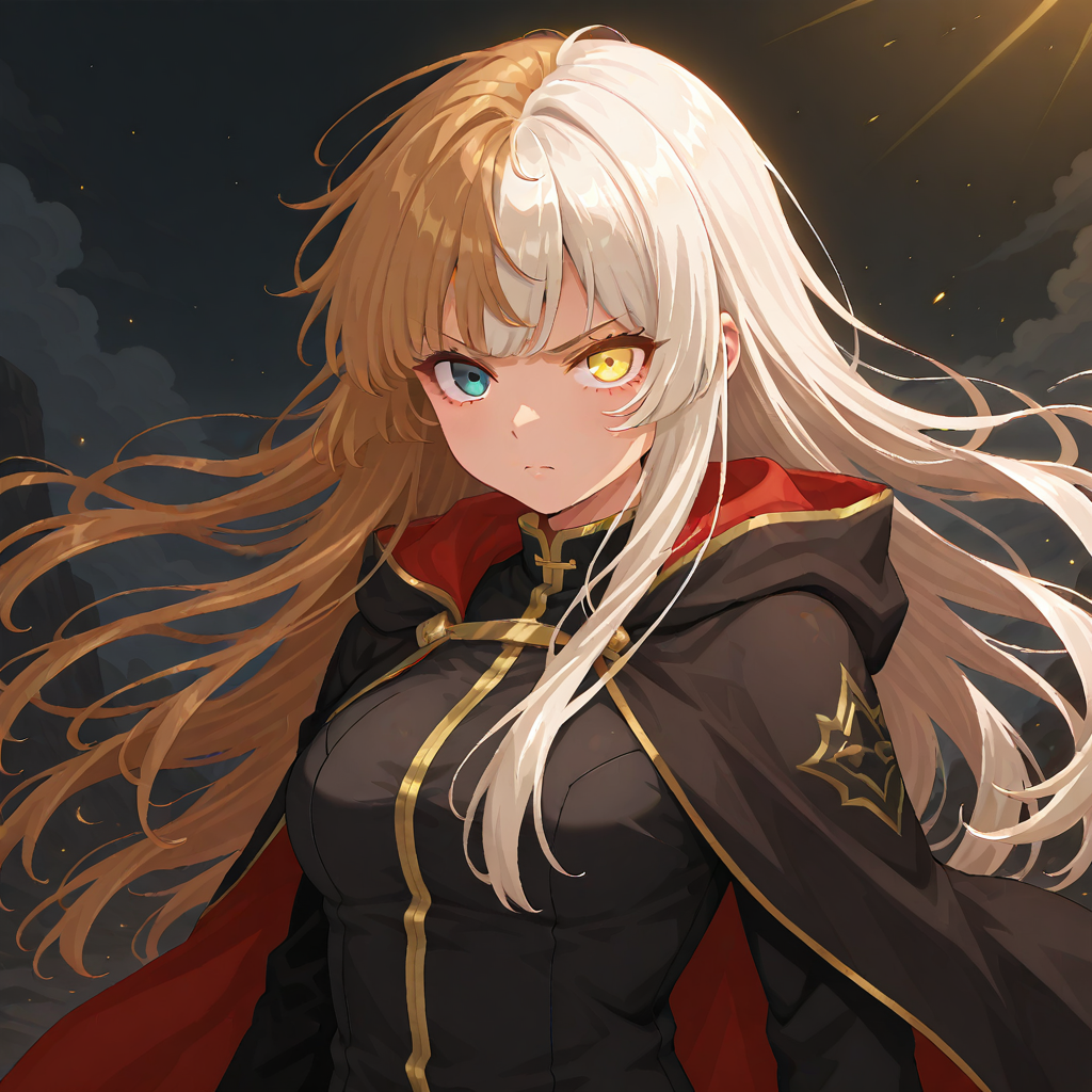 sn-trickster, 1girl, 长侧发, 分色头发, 棕白色头发, 异色瞳, 棕蓝色眼睛, 无头饰,