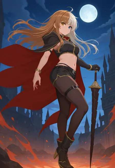 双面斗篷, 黑红色斗篷, 戴帽, 有领短上衣, (单个手镯), (单个分离袖子), (单个半手套), 短裤, 绝对领域, 黑色丝袜, (单个大腿绑带穿过衣物), 靴子,