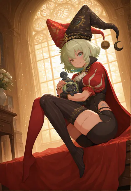 • jester, jester cap, alternate costume, red cape, white_ascot, collared_short_bodysuit, zettai ryouiki, red puff sleeves, stitched_leg, asymmetrical socks, red socks, black vertical-striped socks,