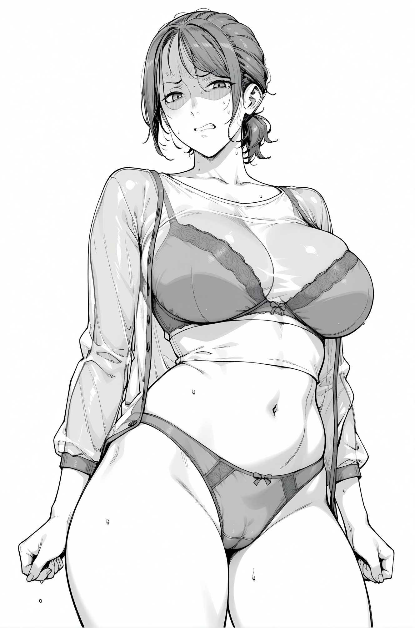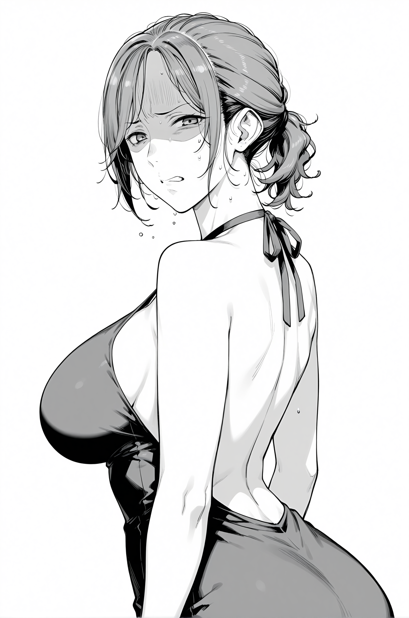 mommy, monochrome, greyscale, mature female, short hair, very short ponytail, parted bangs, big breasts