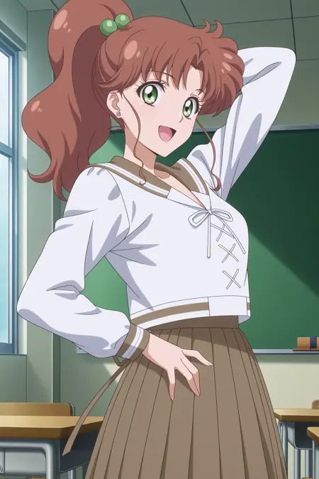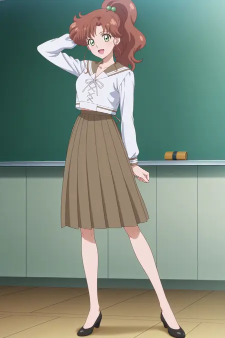 kino makoto, 中等长度头发, 棕色头发, 高马尾, 发饰, 侧发, 绿色眼睛, 花朵耳环, 长袖, 白色衬衫, 棕色水手领, 颈部丝带, 棕色裙子, 百褶裙, 背部丝带, 黑色鞋子, 平底鞋, 高跟鞋