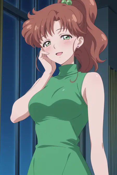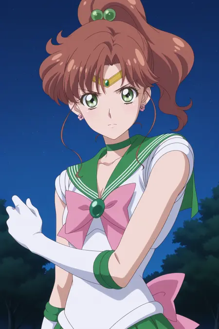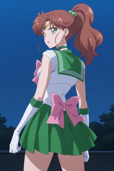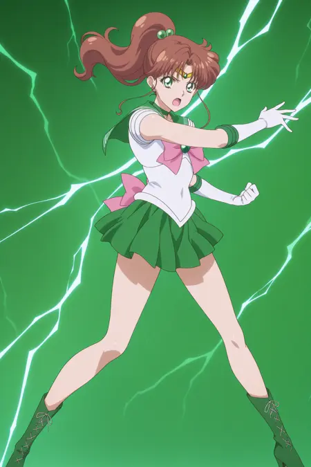 sailor jupiter, 中等长度头发, 棕色头发, 高马尾, 发饰, 侧发, 绿色眼睛, 花朵耳环, 发箍, 水手战士制服, 魔法少女, 绿色项圈, 绿色水手领, 粉色蝴蝶结, 白色手套, 肘部手套, 绿色裙子, 百褶裙, 粉色背部蝴蝶结, 绿色鞋子, 高跟靴