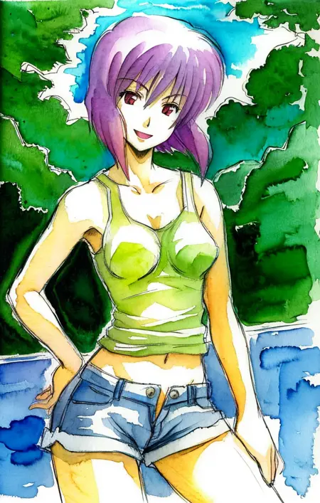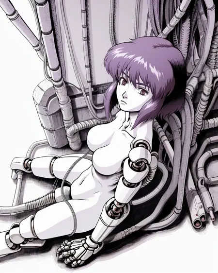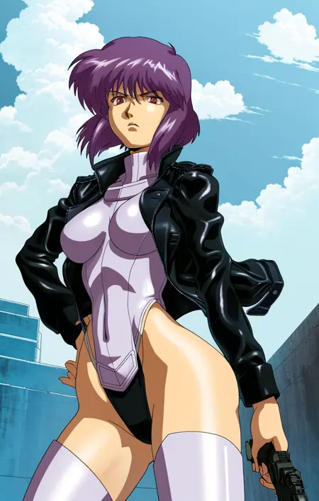 '草薙素子、太ももまで届くレオタード、太ももブーツ、ジャケット' – 通常の太もも魅力的な衣装。