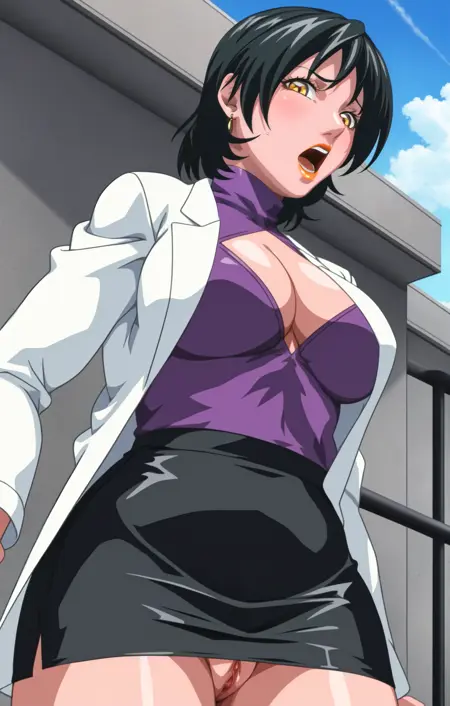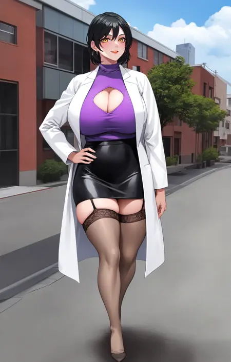 open labcoat, purple shirt, turtleneck, cleavage cutout, pencil skirt, grey thighhighs, garter straps