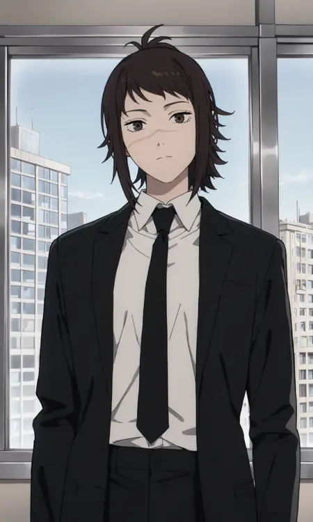 tendomv, 1girl, scar on face, brown hair, medium hair, sidelocks, ponytail, brown eyes,