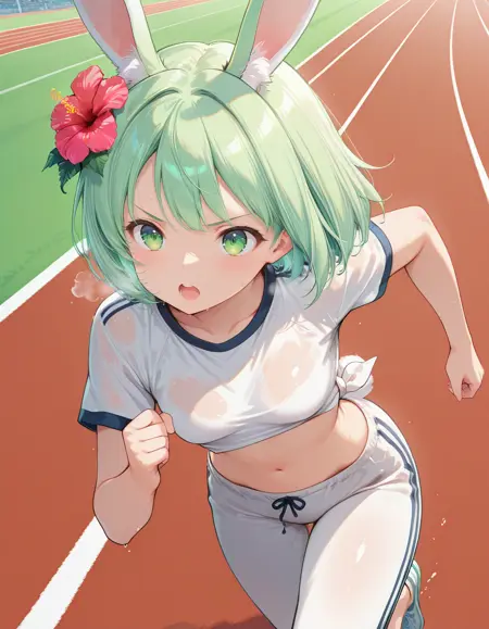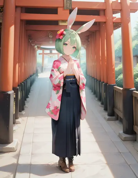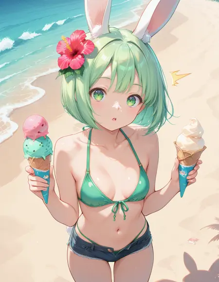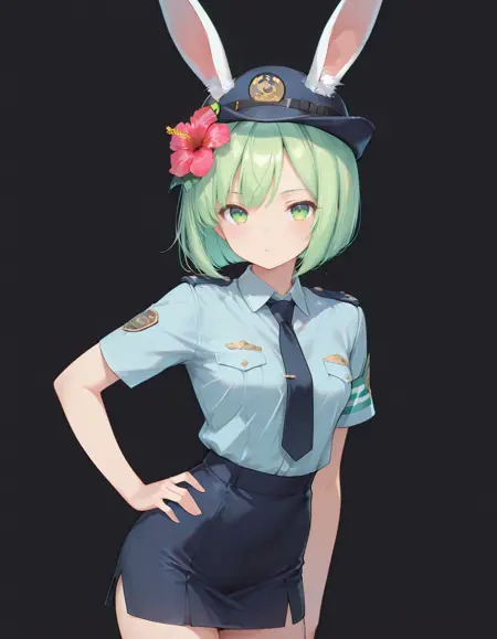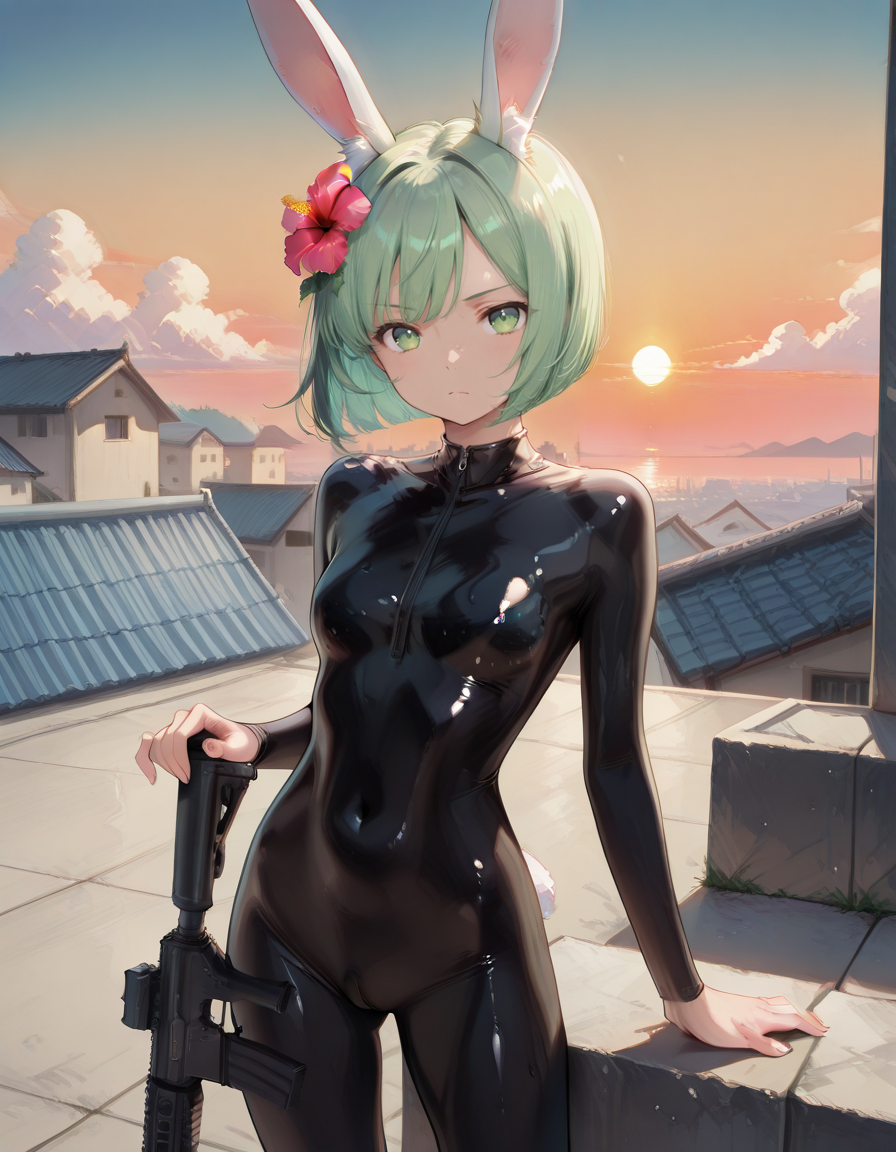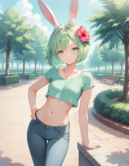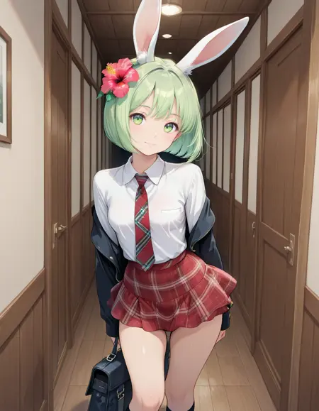 Recommended promt: midori, small breasts, rabbit ears, rabbit girl, green hair, short hair, bob cut, hibiscus hair flower, green eyes